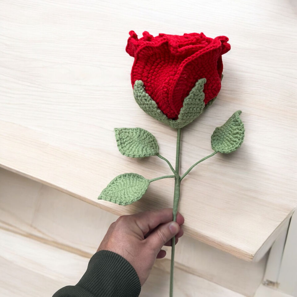Elegant large crochet roses, handcrafted in various colors: Red, White, Peach, and Blush. Their lifelike texture and soft handmade beauty make them the perfect everlasting bloom for any occasion.